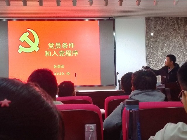 2020年,11月27日18时30分,物理与电子科学学院于理科楼B413室开展了第36期入党积极分子的党课,主题是“党员条件与入党程序”,主讲教师陈鑫宇从我们身边的故事说起,为同学们很好的讲解了党员条件与入党程序,加深了大家对党的理解。