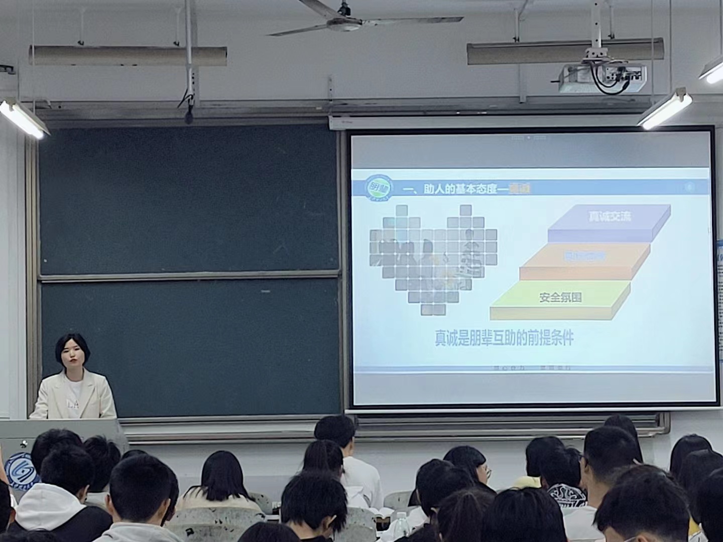 课堂上,楚老师以做随堂小练习的方式,引导同学们积极思考助人基本态度应该包含哪些要点,如何在助人的过程中学会倾听,以及特殊情况下如何陪伴求助对象,使同学们在热烈的讨论中学会助人技巧。最后楚老师还给朋辈们传授了心理自助的一些基本技巧,鼓励大家培养一项放松身心的爱好,以积极阳光的心态面对生活的挑战。