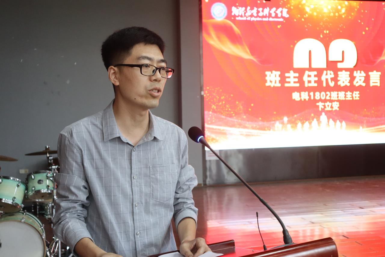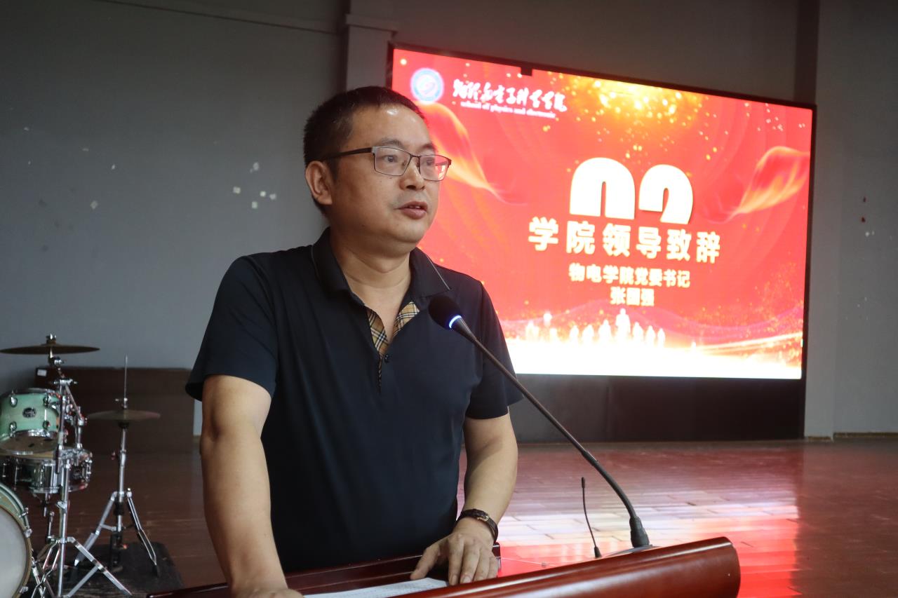 视频结束后,学院党委书记张国强上台致辞,书记肯定了同学们大学四年的努力,表达了对同学们的成长的欣慰,同时勉励在座同学未来不断努力,常回家看看,物电学院永远是你们最温暖的家。随后毕业生班主任代表卞立安老师发言,并播放了满载老师寄语的短视频,班主任和导师代表们表达了对同学们大学及研究生生涯的肯定和对未来的勉励。学生代表们自发向老师们献花,表达了对老师们谆谆教导的由衷感激。