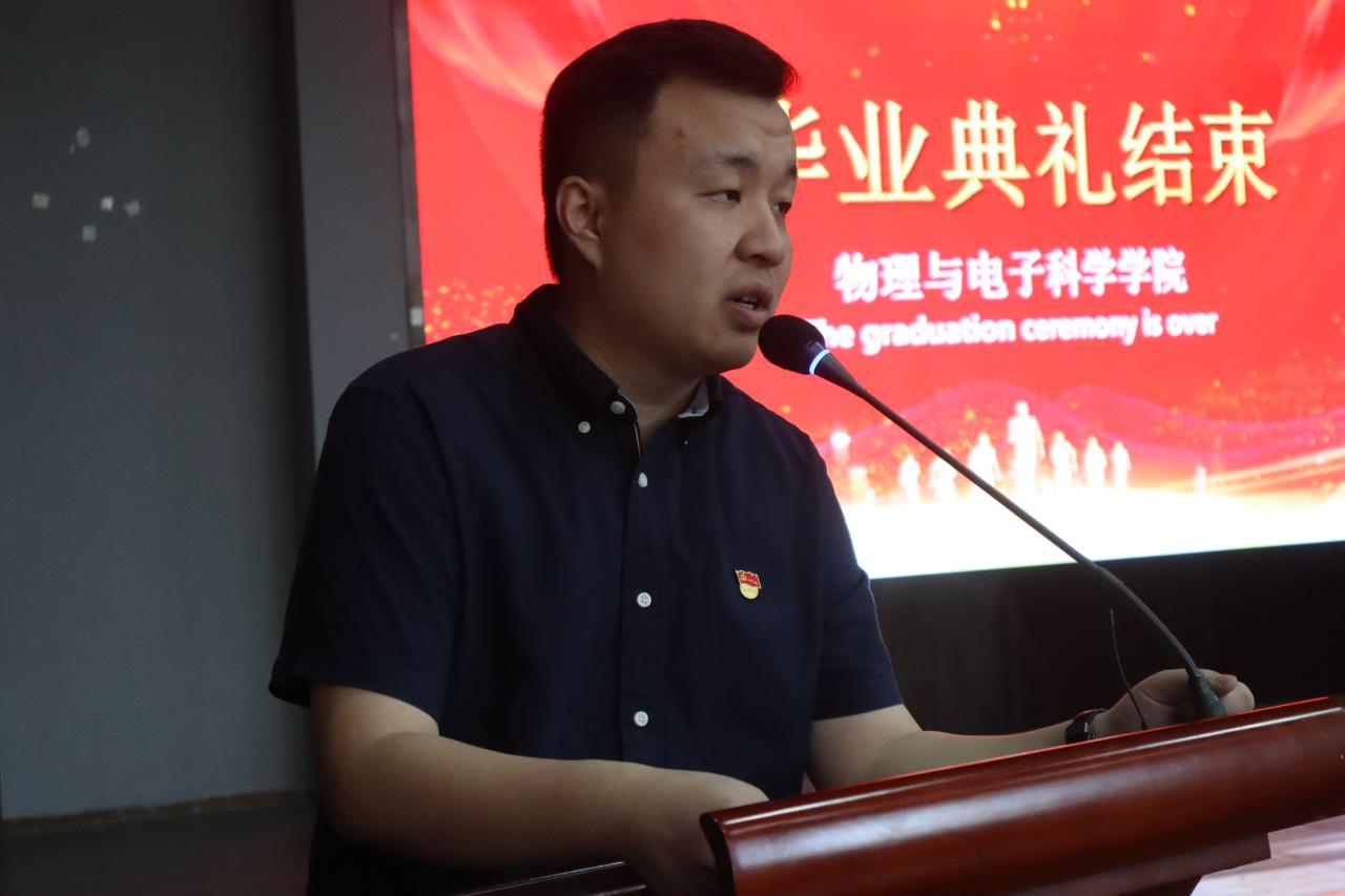 6月14日下午2点30分,物电学院2022届毕业典礼在开云kaiyun体育云塘校区科技报告厅举行,参加本次典礼的有全体院领导、毕业班班主任、导师代表及全体本科生、研究生毕业生,典礼由毕业生辅导员王中兴主持。