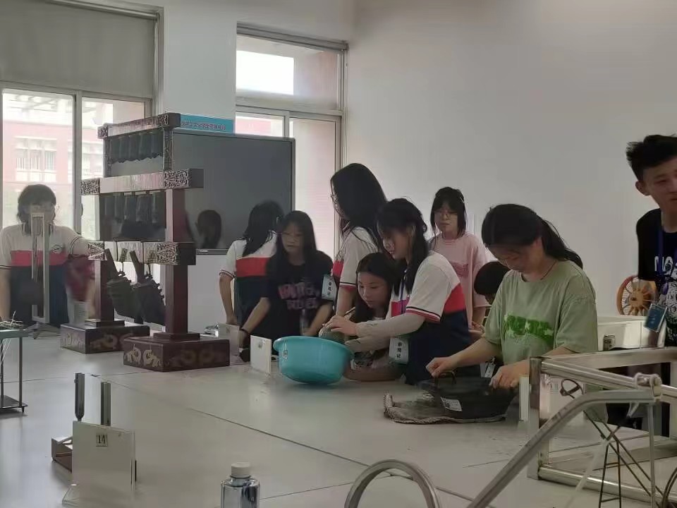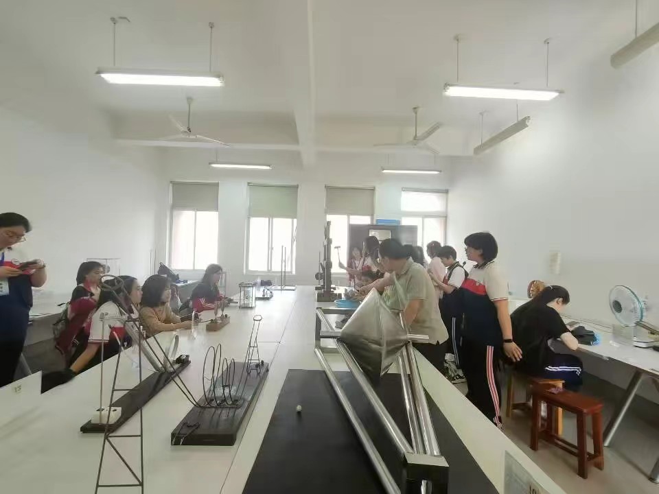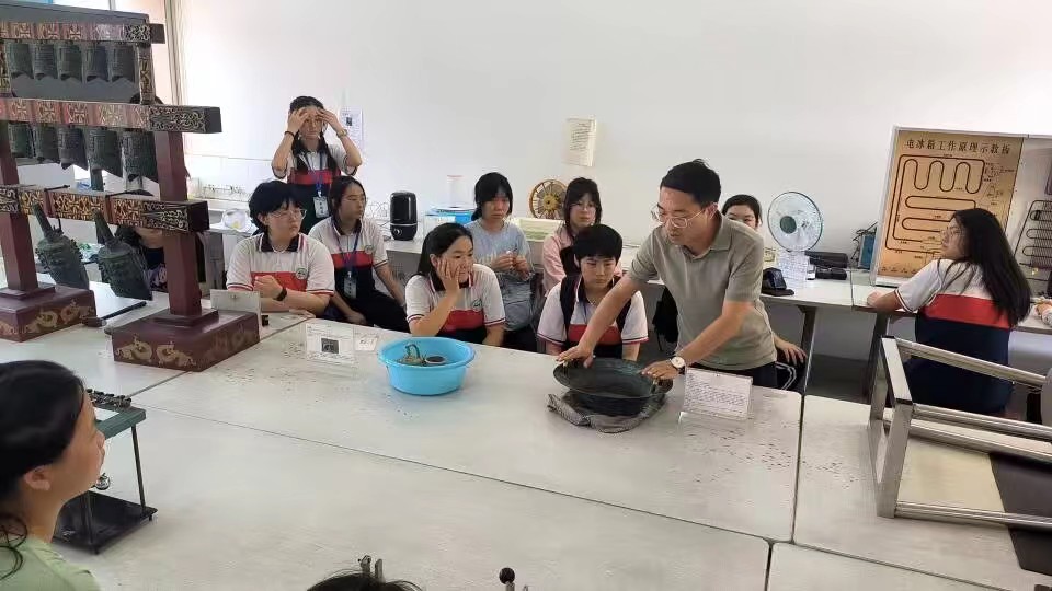 醴陵五中的同学们在老师的带领下前往三全育人馆了解长理的发展历史、办学理念和学科建设等,随后分成不同的小组进行相关的学习。接着,同学们来到物理与电子科学学院参观学习,并在综合实验楼A402观看力热学综合演示。伍丹老师为同学们进行讲解,并向同学们展示了一个个神奇又充满科学的力热学现象,如编钟声学的特点、鱼洗、转动惯量与转动定律、椎体爬坡、冰箱空调演示仪等。同学们悉心听讲,积极提问,老师也耐心地回答着同学们的问题,最后,部分同学们在伍老师的指导下也亲手进行了实验。