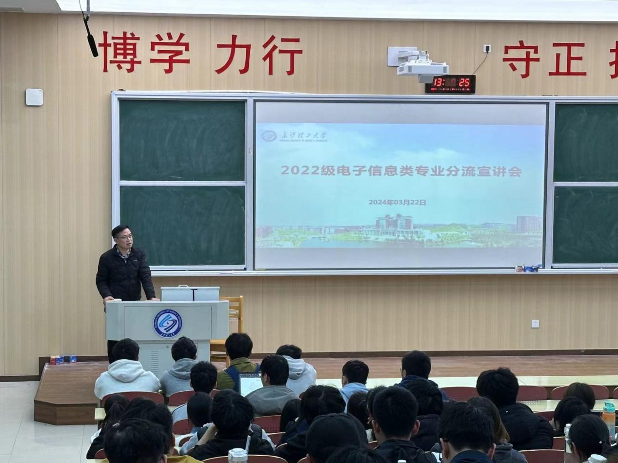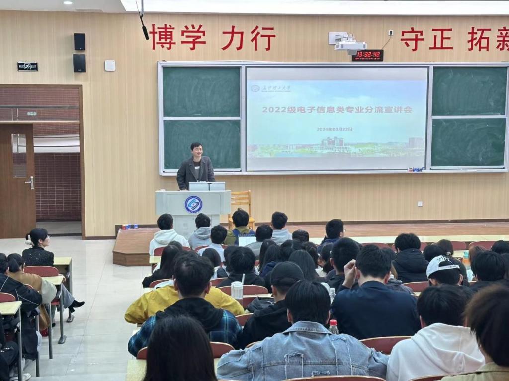 3月22日13:00,物电学院2022级电子信息类专业分流宣讲会在综教B102和B202教室举行。学院副院长张卫兵(主持工作)、副院长范志强、电子信息系老师文勇军、商雄军、唐俊龙以及2022级辅导员马凯文出席参与了此次活动,会议由学院党委副书记宋国宁主持。