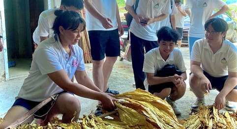 当日上午,志愿者一行由驻村干部们和党总支部书记助理黄积新带领来到了三井烤烟工厂。据负责人介绍三井镇种植烟叶种植面积有700亩,占当地经济发展80%,且当地实行”烟稻轮作”模式。三井烟叶工厂共有64座烤烟房,志愿者了解到,烟叶的种植分配到个体户,丰收时间为6月初到7月中,持续45天左右。