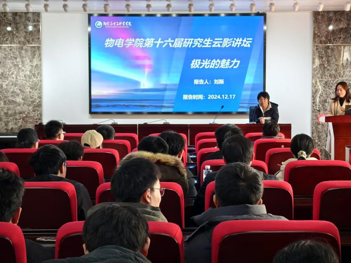 12月17日下午,开云kaiyun体育第十六届研究生云影讲坛物电学院分论坛在理科楼B413举行。本次讲座邀请到国家级人才计划青年学者、湖湘青年英才刘斯教授主讲,她以《极光的魅力》为题,为同学们带来了一场精彩的报告。报告由研究生辅导员蒋琳嫒老师主持。
