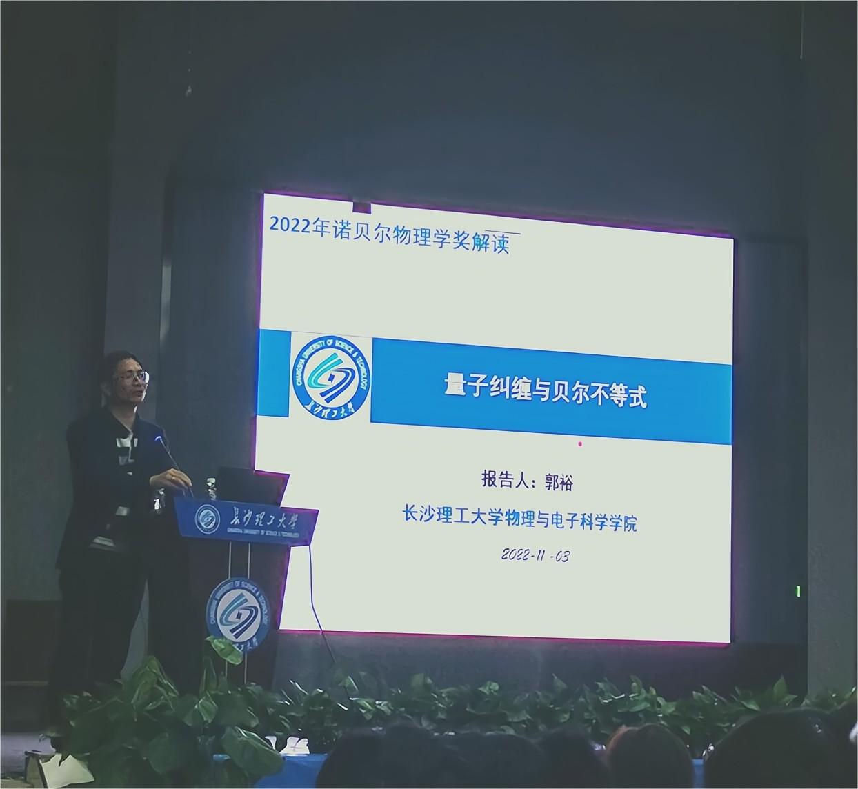 2022年10月4日,瑞典皇家科学院宣布将诺贝尔物理学奖授予阿斯派科特、克劳瑟和蔡林格,以表彰他们在“纠缠光子实验、验证违反贝尔不等式和开创量子信息科学”方面所作出的贡献。为提高学生对量子纠缠与贝尔不等式的理解,11月3日晚19:30,物理与电子科学学院学院在云塘校区学生活动中心科技报告厅举办“量子纠缠与贝尔不等式”通识讲座,本次讲座由物电学院张卫兵院长主持,郭裕教授主讲。