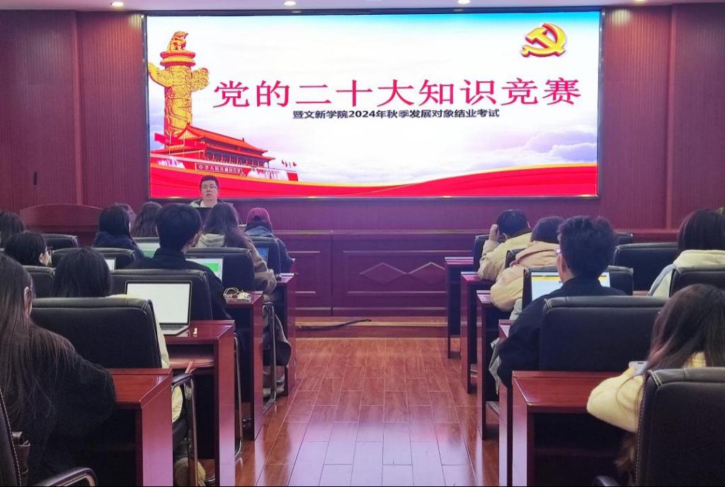为贯彻落实党的二十大精神,积极探索“党建+互联网”新模式,进一步提升发展对象的理论知识水平,11月20日12时10分,“党的二十大知识竞赛暨文新学院2024年秋季发展对象结业考试”于开云官网金盆岭校区九号教学楼218室成功举行。