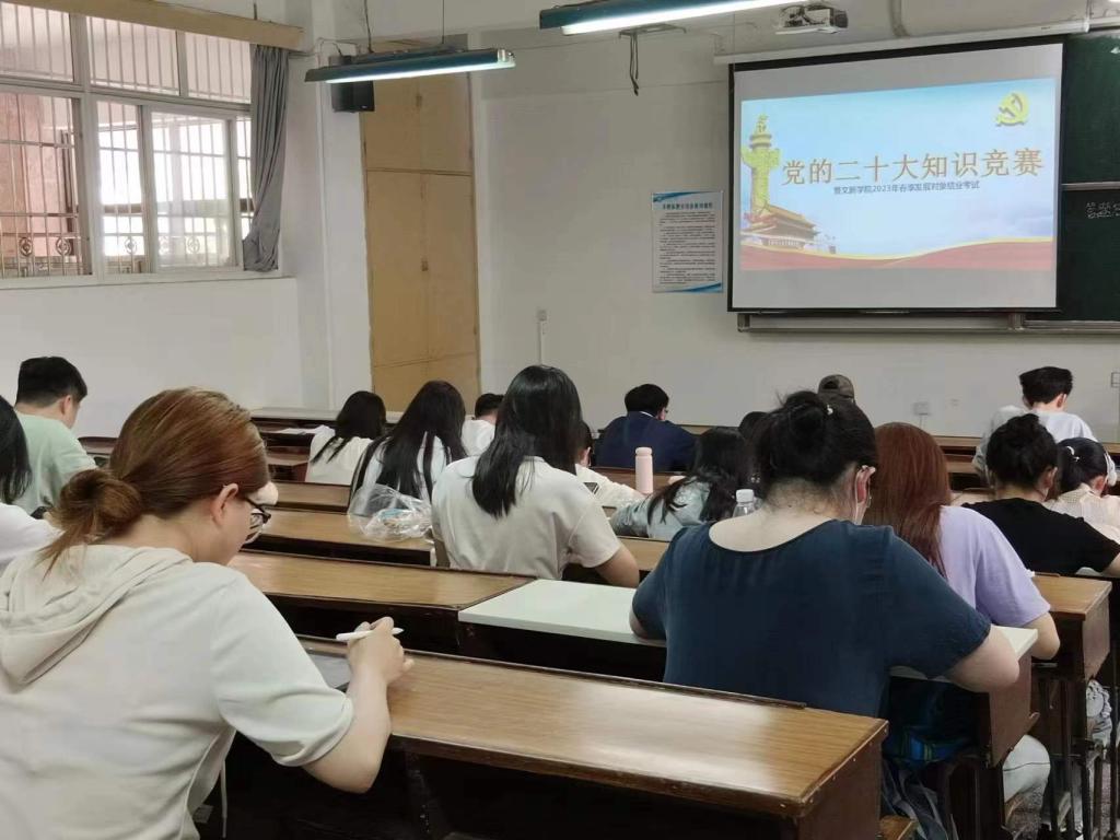 为深入落实并贯彻落实党的二十大精神,积极探索“互联网+党建”的新模式,进一步提升党员发展对象的理论知识能力水平,2023年6月6日13点30分,“党的二十大知识竞赛暨文新学院2023年春季发展对象结业考试”于开云官网金盆岭校区三号教学楼成功举行。