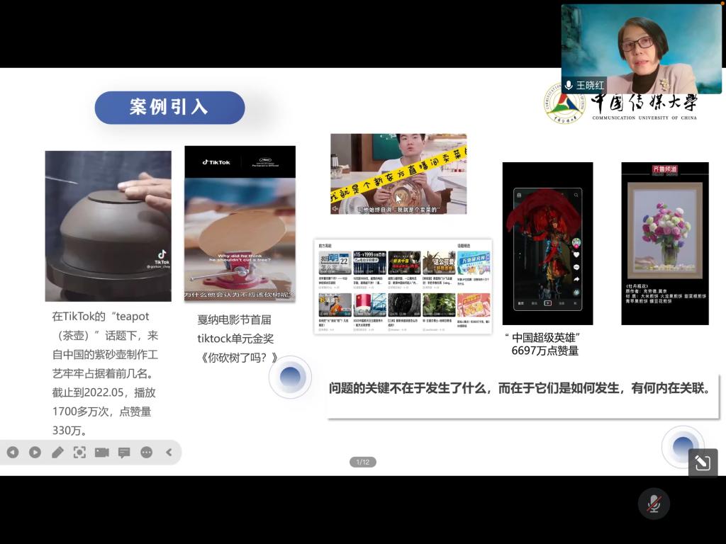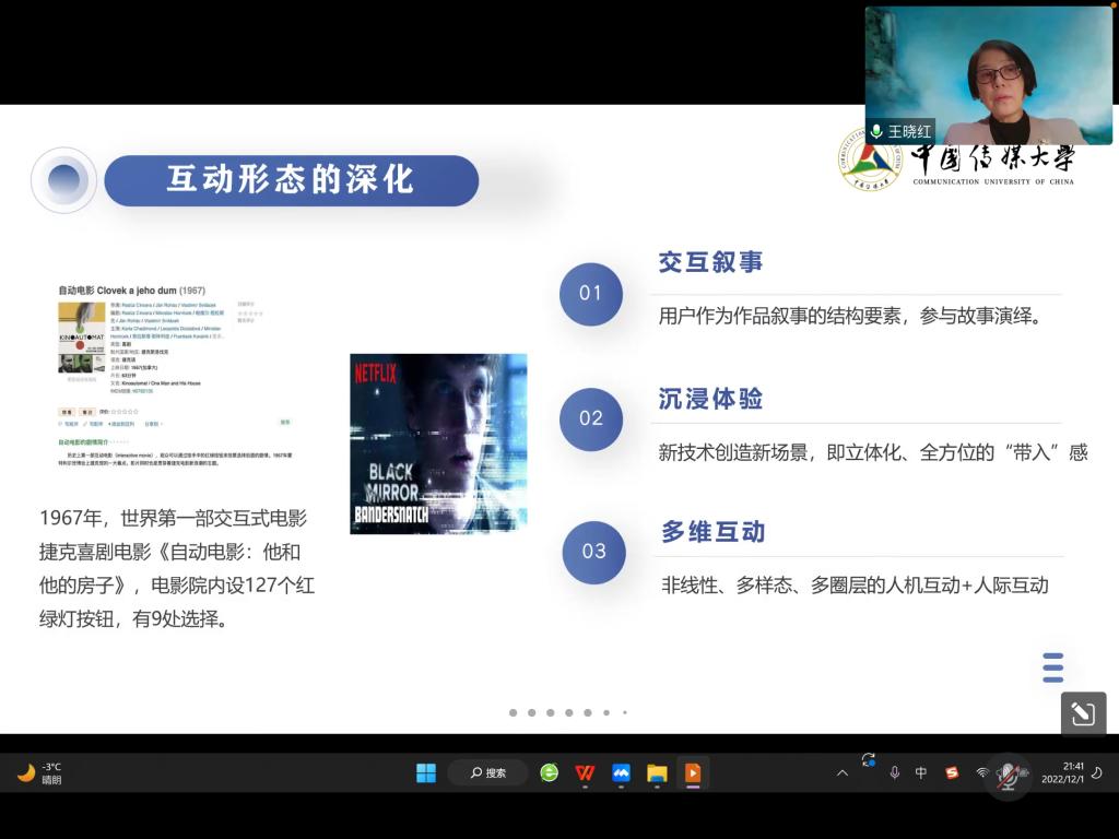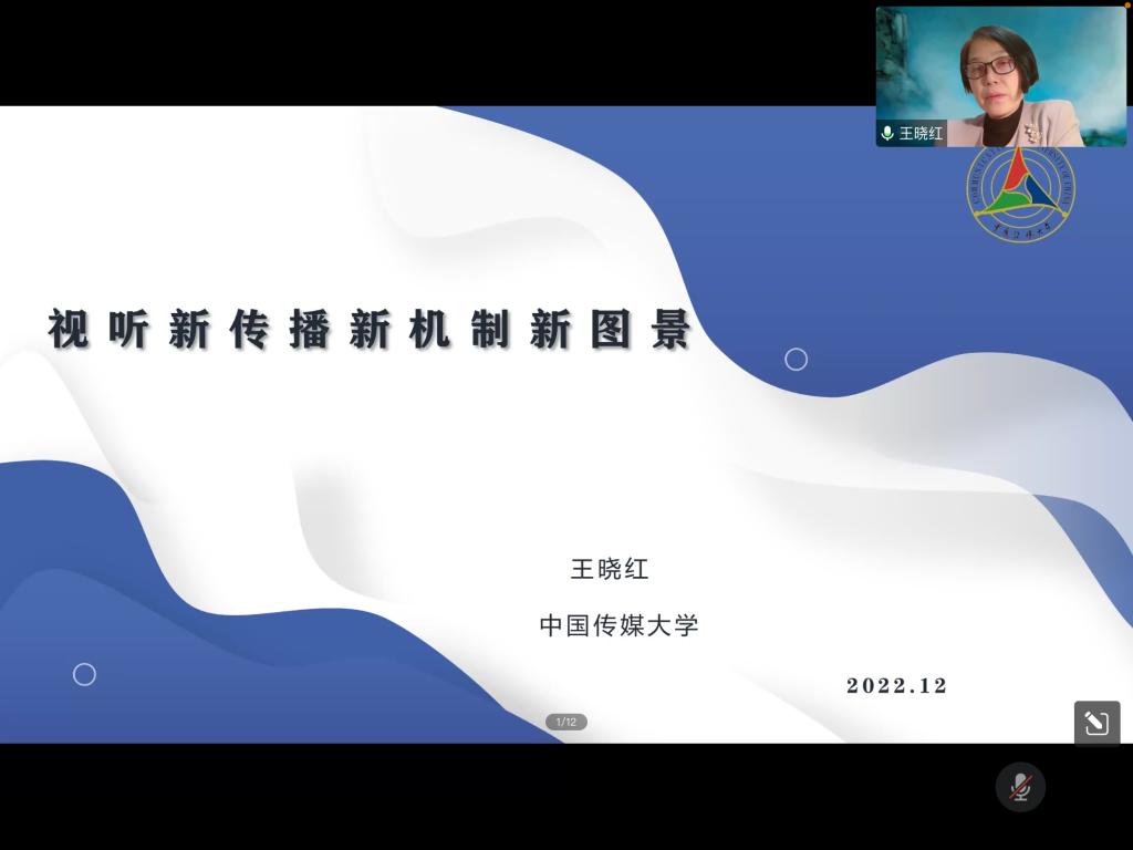 2022年12月1日晚,第十四届研究生云影讲坛文学与新闻传播学院分论坛第五期如期举行。中国传媒大学本科生院院长王晓红教授应邀为开云官网师生开展主题为“视听新传播新机制新图景”的讲座。本次讲座以线上的方式进行,院长刘建新教授担任主持,赵继光老师、陈健强老师参与讲座。