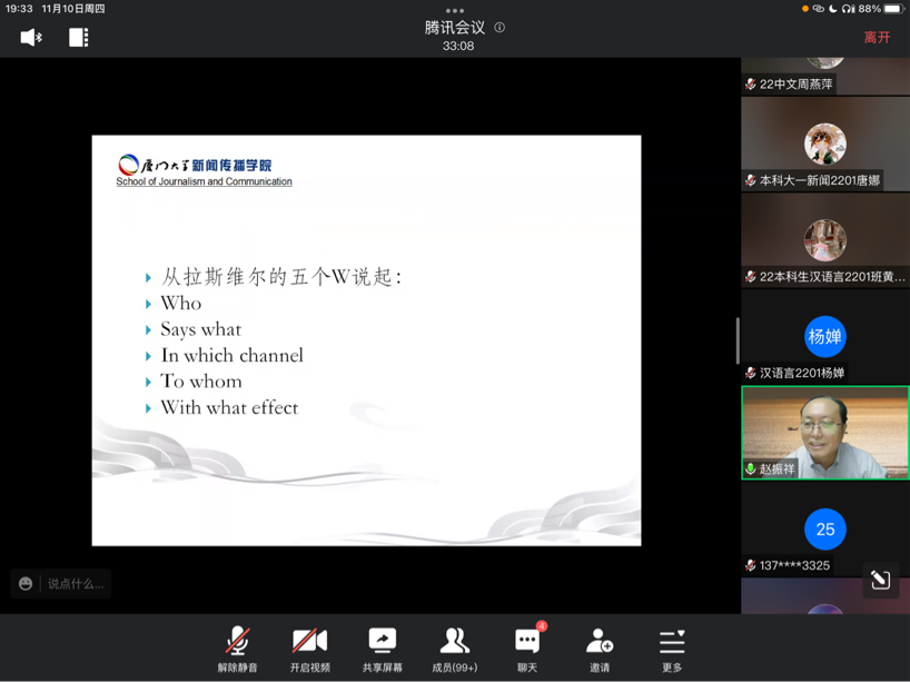 讲座伊始,赵振祥教授对拉斯维尔的五个“W”进行了简单的阐释,他以五个“W”为基本框架,开始了正式的讲授。