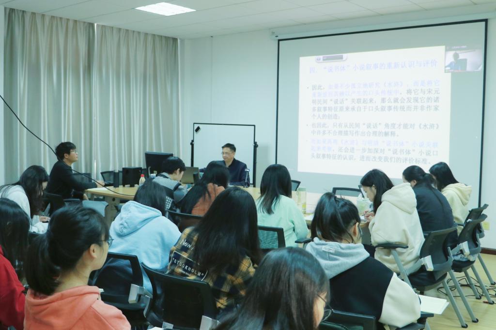 2022年10月8日上午9点,开云kaiyun体育第十八届研究生博力学术论坛文新学院分论坛第三期于金盆岭校区7教306举行。广州大学人文学院纪德君教授为我院师生开展了主题为“口头传统规约下的小说叙事——以《水浒传》为中心”的讲座。此次讲座线上线下同步举行,引起了我院师生的广泛关注。文新学院党委委员郑劭荣教授担任讲座主持人,中文系华德柱副教授、王福雅副教授、周静副教授、王莉老师、向双霞老师等出席了本次讲座。22级中文研究生及22级汉语言文学本科生全体参与听讲。