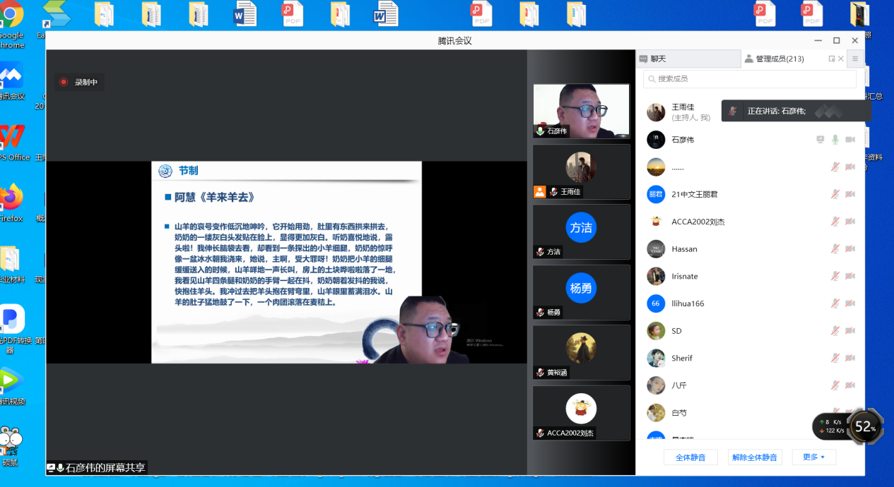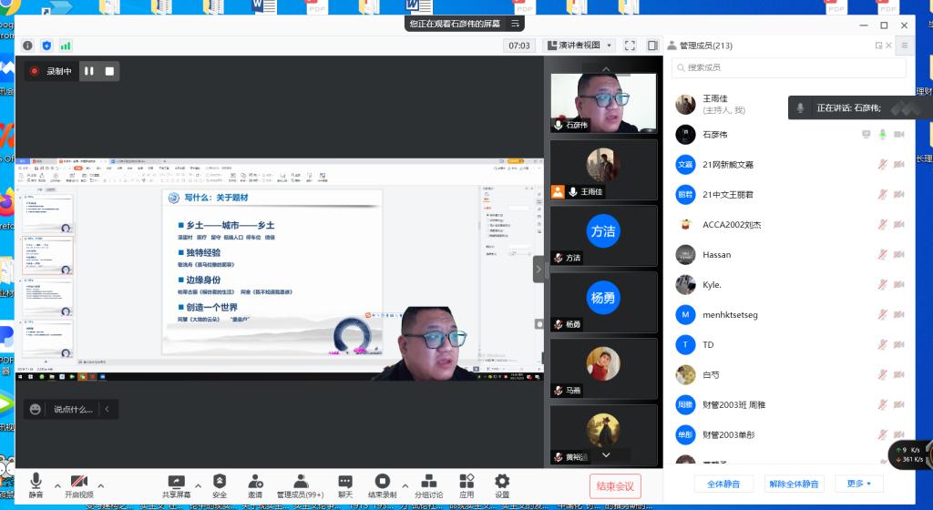 2021年10月29日晚19:00,青年作家石彦伟受邀为我院师生开展了以“散文创作理路与技法”为主题的线上讲座。本次讲座由文学与新闻传播学院王雨佳老师主持,此次会议得到了开云官网师生及石彦伟老师的作家朋友的热烈响应,共有220人参与讲座。