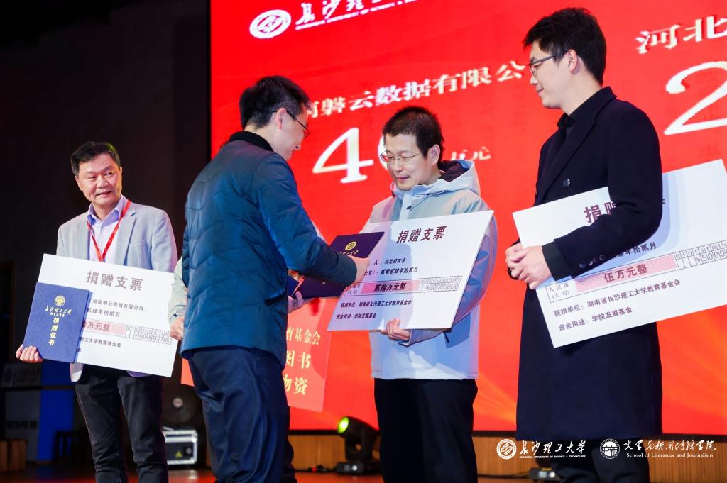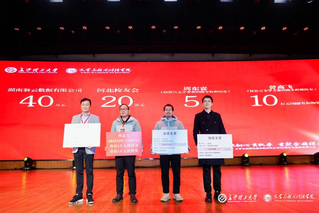 在刘原的带领下,汉语言文学专业95级校友曾高飞、周东喜和河北校友会代表、汉语言文学专业98级校友郭伦一同上台,分别现场捐赠40万元、价值10万元的图书和物资、5万元和20万元。学院党委书记陈仁凯上台接受捐赠,并给4位校友颁发捐赠证书。全场响起热烈的掌声。