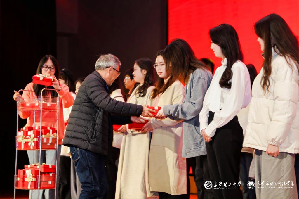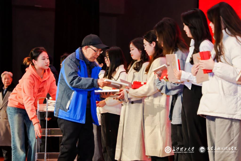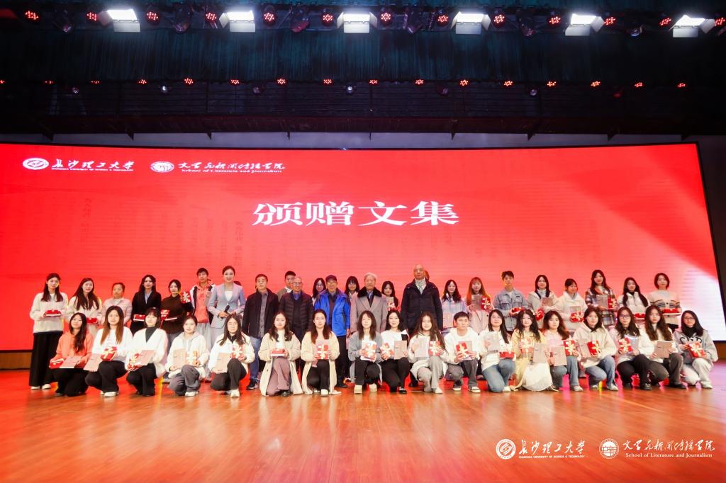 文集主编成松柳教授上台讲述了文集创作前前后后的故事,学院本科办学40年来的历程在他的讲述中注入现场每一名听众的心田,赢得了现场的阵阵掌声。随后,他邀请文集的主创人员胡正微教授、谌东飚教授、夏先培教授、华德柱教授等上台,一起给在校学生颁赠文集,各班级代表双手接过了这份珍贵的礼物。这一送一接,蕴含着学院文化和精神的传承。