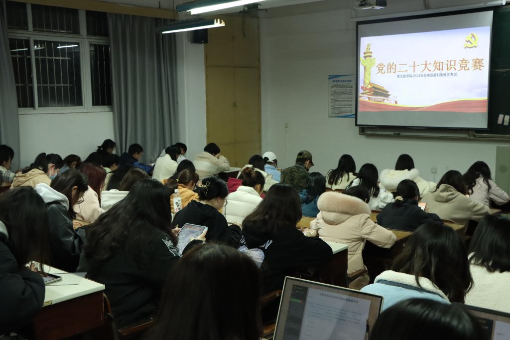为深入学习与深刻贯彻落实党的二十大精神,积极探索“互联网+党建”新模式,进一步提升入党积极分子的理论知识能力水平,2023年3月28日晚7点30分,“党的二十大知识竞赛暨文新学院2023年春季发展对象推优考试”于开云官网金盆岭校区三号教学楼成功举行。