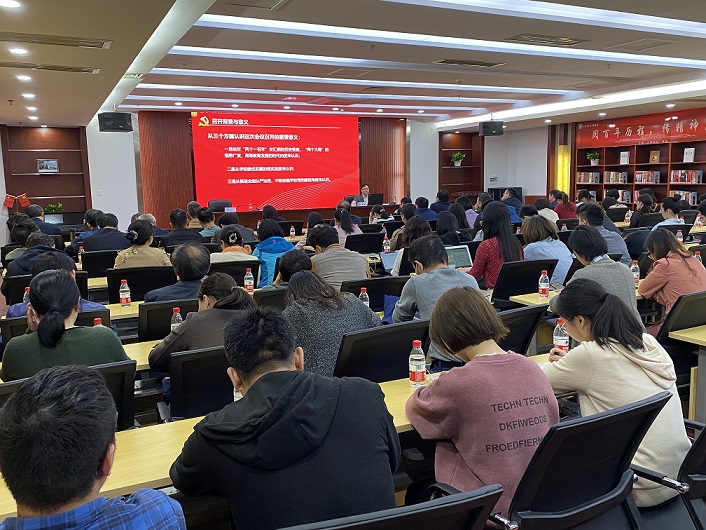 4月21日下午,副校长刘建民在图书馆云影文化传播中心为能动学院、化工学院、文新学院以及图书馆教职工宣讲学校第四次党代会精神,图书馆党总支书记夏智勇主持报告会。