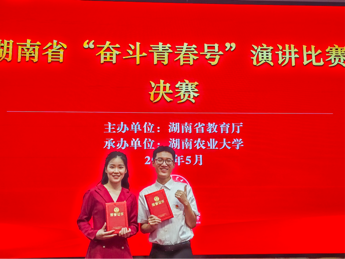 5月21日下午,湖南省“奋斗青春号”演讲比赛决赛在湖南农业大学落下帷幕。我21级新传研究生赵冉汉语言1904班冯严冬的个人演讲分别获得湖南省一等奖和二等奖,22级网新班汪卓等人的团体演讲获得湖南省三等奖。