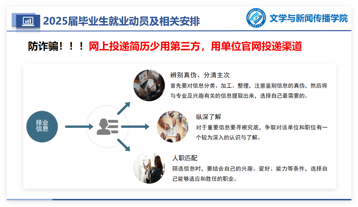 最后,由2025届第一位成功签订三方,新卓2101班李彪同学为毕业生们分享自己的求职经历。李彪表示作为求职者平时要积极联系已就业的学长学姐或者老师进行推荐;对应聘央国企的文职综合岗,要多熟悉公告、通知、发言稿、函、会议纪要等具有公文性质的写作会更有优势;对于面试中的情景假设题,要多从HR的设问角度思考问题;可以通过跟朋友老师倾诉缓解面试等待的紧张感等四点求职心得进行经验分享,给毕业生同学就业提供了一个很好的参考。