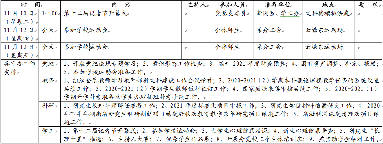 文新系2020-2021学年度第一学期第十周工作安排表