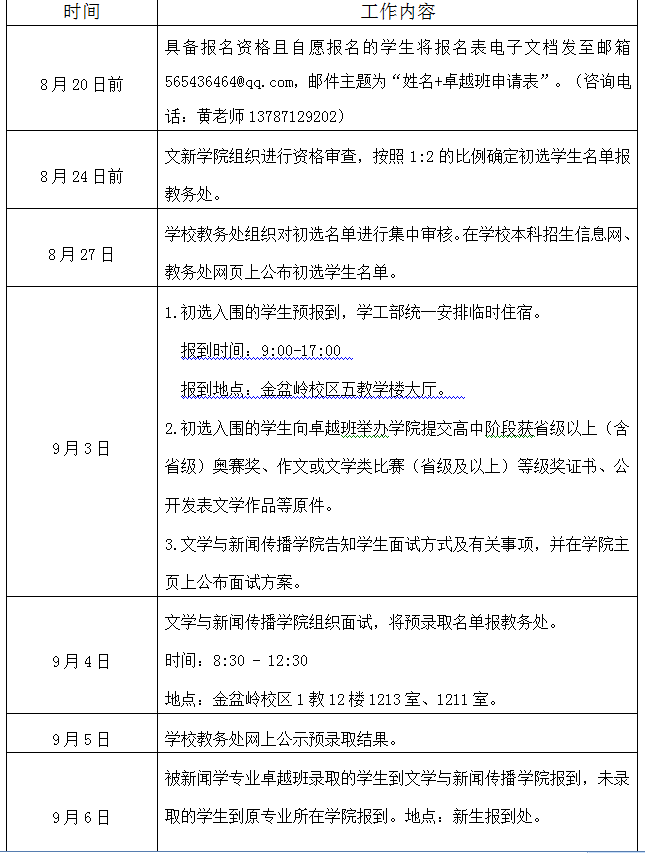 (3)符合报名条件的学生在8月20日前将《“卓越班”申请表》(word文档),以邮件“附件”形式发至新闻卓越人才培养培养试点班联系人邮箱565436464@qq.com,邮件主题为“姓名+卓越班申请表”。未在规定时间内以规定形式报名的将不予受理,报名表见附表1(见附件1)。