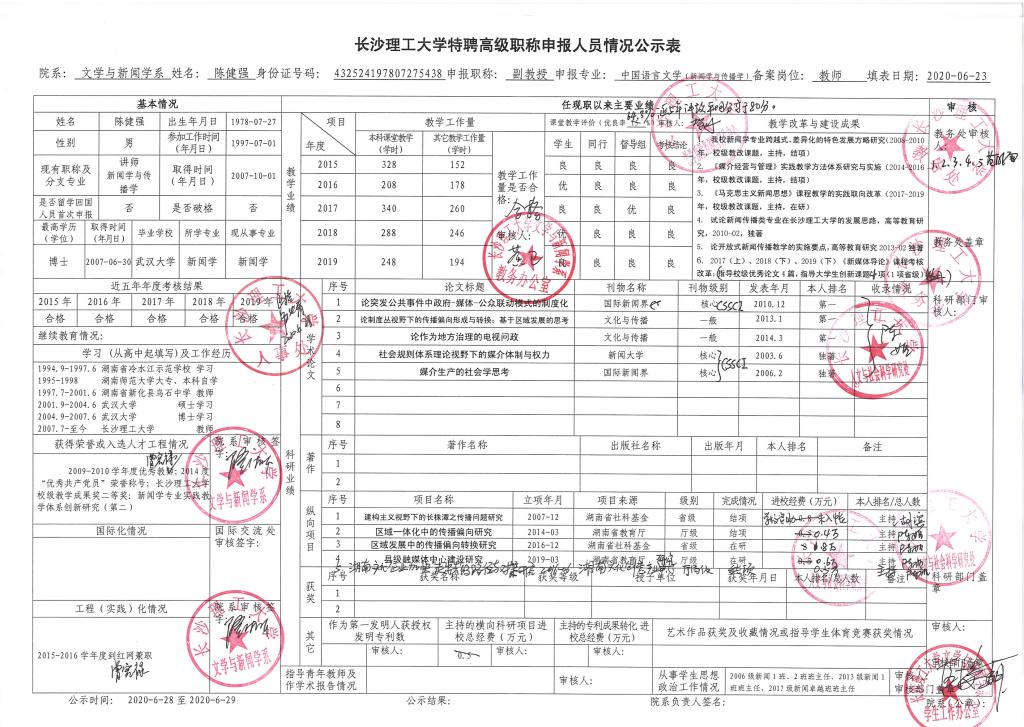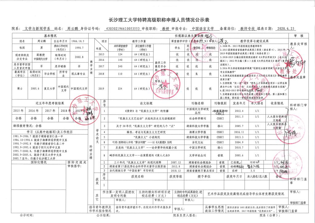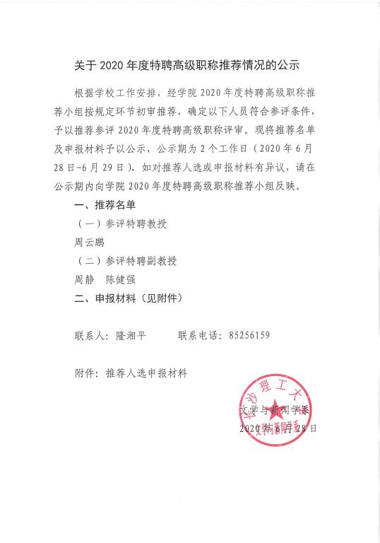 关于2020年度特聘高级职称推荐情况的公示