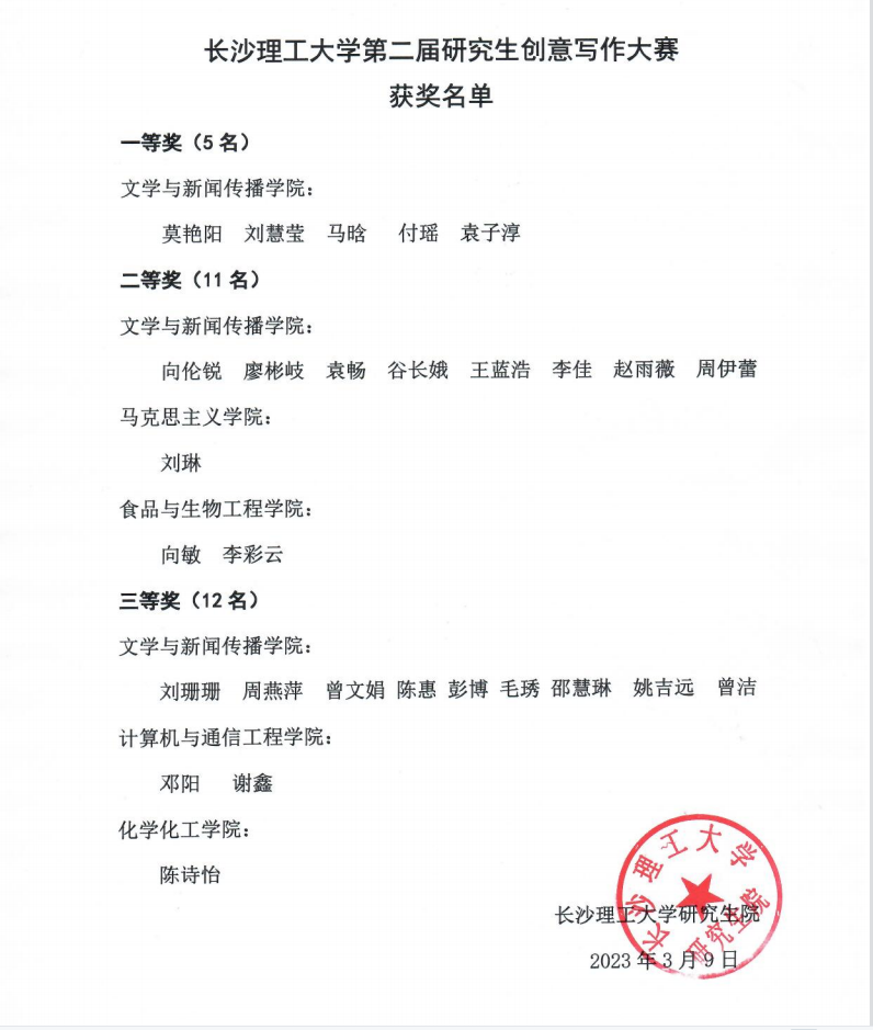最后,经组委会专家评定,文新学院莫艳阳、刘慧莹、马晗、付瑶、袁子淳五位选手获一等奖,她们将代表开云官网参加湖南省第二届研究生创意写作大赛。