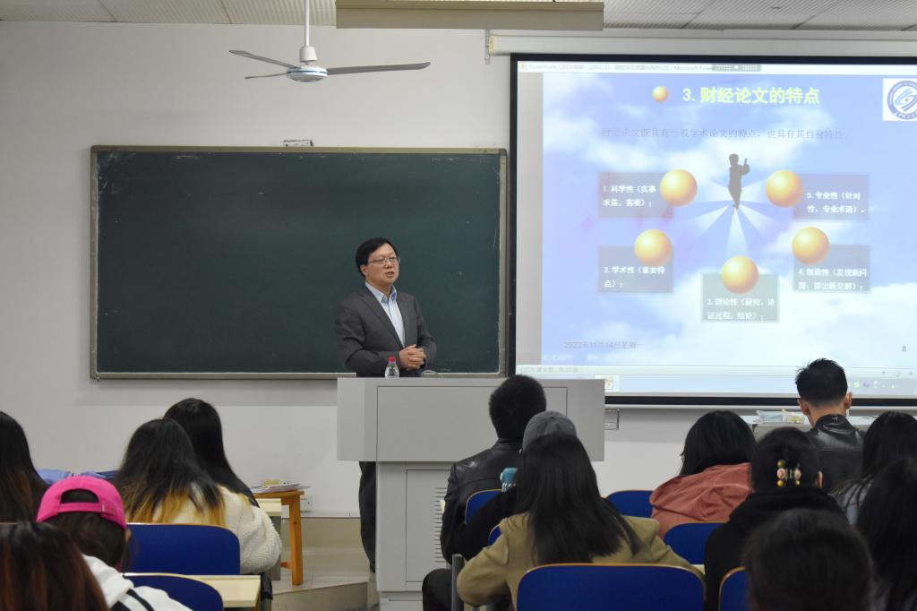 刘建民通过财经论文概述、财经论文选题、财经论文写作三部分开启了本次授课,他以“秧好一半谷,妻好一半福,题好一半文”的古语为引阐述选题的重要性,他指出选题要围绕“有意义、有兴趣、有准备、有基础、有创新”等五个方面入手。他强调论文写作基本原理相通,细致阐述了选定题目、文献搜集、草拟提纲、撰写初稿、论文修改和定稿投稿等六个完整环节的注意事项,勉励同学们在论文写作中要结合中国国情、寻找学科交叉点、做好文献搜集、敢于发现和解决问题,从而在论文写作中实现题目“养眼”,框架“养心”,内容“养脑”。刘建民通过领学党的二十大报告,引导同学们加深对党的创新理论成果的领悟和理解,勉励未来的新闻从业者们主动增强政治素养,用手中的笔书写时代华章。