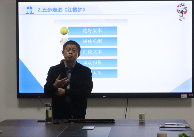 活动初始,华德柱做了题为“从《红楼梦》说到琼瑶——以爱情为中心”的分享,讲述了自己从小学开始到工作后与《红楼梦》的缘分与故事,随后从“选好版本、抓住总纲、细读文本、调动积累、思考人生”五步带领同学们走进《红楼梦》的学习之中。从《红楼梦》中宝黛的爱情展开思考,针对当前“琼瑶的离世,象征着一个时代的终结”争论,华德柱表示,这样的观点太过悲观,自古以来人们就追求理想主义的爱情,虽然现实中人们总处于自我防备状态,但对于理想爱情的追求在文学作品中仍然熠熠生辉。华德柱认为,读懂《红楼梦》,要学会相信人性,相信爱情。