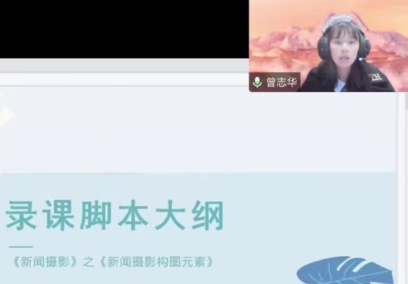 沙龙的第二个环节,邀请了荣获“湖南省青年教学能手称号的曾志华老师进行了教学示范课程展示。曾志华老师坚持以教学为中心,注重钻研教材教法,以《新闻摄影》课中的“新闻摄影构图元素”的录课脚本大纲为例,分享了她在教学设计思路和参赛经验。