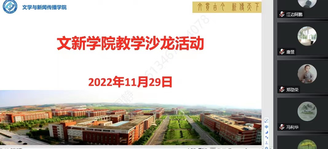 2022年11月2919:30,文学与新闻传播学院举办了2022年线上教学沙龙活动,活动主题为“教学竞赛经验研讨与交流”。院长刘建新、副院长周云鹏、副院长魏桃初以及学院部分教师30余人参加了此次活动,副院长戴钰主持。