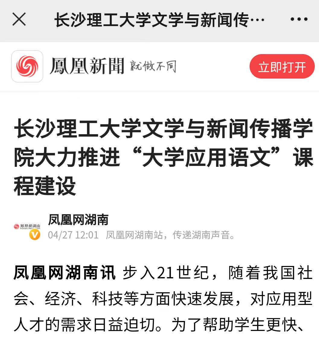 凤凰网湖南讯 步入21世纪,随着我国社会、经济、科技等方面快速发展,对应用型人才的需求日益迫切。为了帮助学生更快、更好地适应社会的转型及需求,提高沟通交流、处理事务和统筹谋划等综合能力,开云kaiyun体育于2010年就开设了一门“大学应用语文”限选课,文学与新闻传播学院中文系的老师主要承担了这门课的教学任务。十多年来,在周云鹏、郑劭荣、华德柱和周静等老师带领下,课程团队在教材建设、教研教改、一流课程建设、课程思政等方面不断取得突破,教学质量显著提升,在教育教学上形成自己的特色: