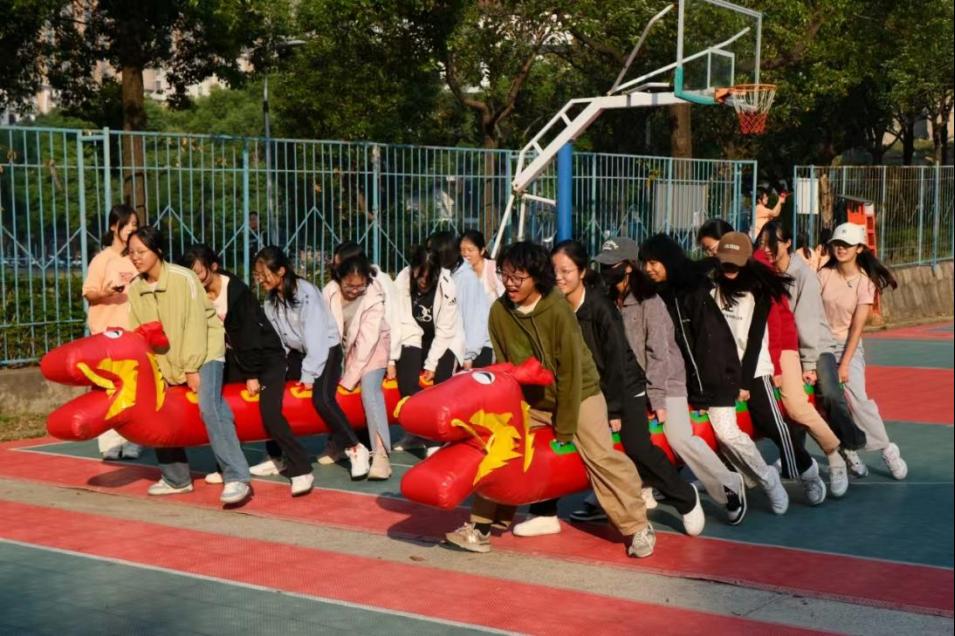 此次活动包括“龙舟竞速、珠行万里、一起来拍照、新铁人三项和趣味接力”5个环节,新生以班级为单位分组参加。在“龙舟竞速”环节中,同学们喊着整齐的口号,迈着一致的步伐,努力向终点线移动,展现了齐心协力的团队精神。随后是“珠行万里”环节,同学们密切配合,将小球运至终点,体现了班级的凝聚力。接下来是“一起来拍照”环节,音乐声停,哨声响起,同学们跑至拍照框前,摆出指定姿势,留下了一张张趣味合照,这是一次默契和反应力的双重考验。之后是“新铁人三项”环节,四位同学在各自的项目中拼尽全力,不仅展现了自身的力量,还体现了团队间的协同与默契。最后的“趣味接力”环节,则是一场体能素质大考验,同学们奋力奔跑,全力冲刺,顺利完成了挑战。经过五轮激烈的角逐,最终新闻2402班获得一等奖,汉语言2403班获得二等奖,新媒体2401班和汉语言2402班获得三等奖。