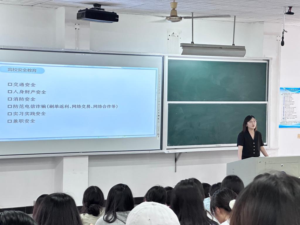 6月20日上午,文新学院于金盆岭校区12教300教室举行2023级本科生学风建设暨安全教育大会,年级辅导员李婵主持,23级全体同学参加。