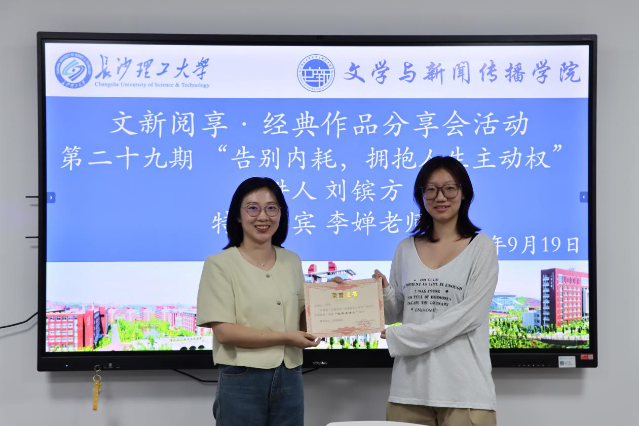 活动最后,李婵为刘镔方颁发荣誉证书并合影留念。本次分享会为同学们搭建了心理学知识交流的平台,助力大家深化对自我与人际关系的认知,启发大家以“被讨厌的勇气”直面生活困惑,在成长中收获幸福与力量。