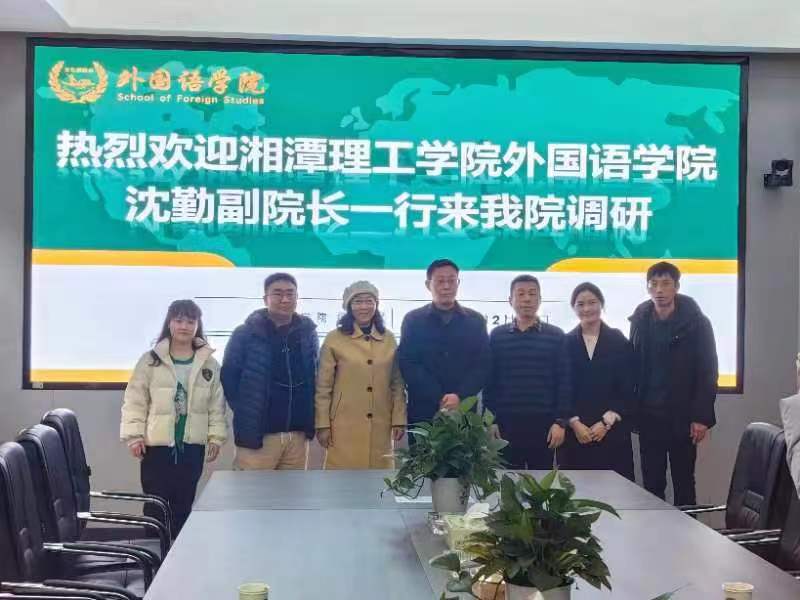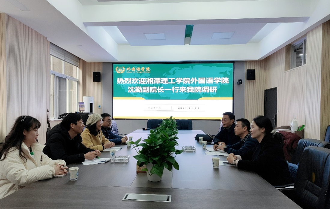 12月15日下午,湘潭理工学院外国语学院沈勤副院长一行四人来我院调研。外国语学院对本次调研活动高度重视,院长段胜峰和教学副院长黄坚出席了调研活动。双方就专业建设、专业实习实践及实习基地建设、一流课程的打造、第二课堂活动的开展、工程英语系列教材编写等方面进行了深入探讨。