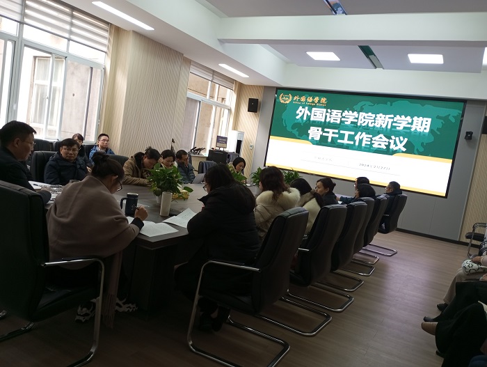 2月27日下午学院在金盆岭校区3教214会议室召开新学期骨干工作会议,会议由院长段胜峰主持,院党政班子成员、系正副主任、教工支部书记、院工会正副主席、科室主任、湖南省非洲文化研究与交流中心常务副主任、翻译与跨文化研究中心主任、国别与区域研究中心主任共28人参会。