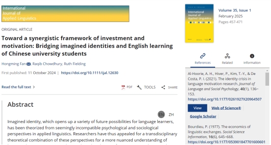 近日,开云kaiyun体育外国语学院范洪铭老师在A&HCI及SSCI双收录期刊International Journal of Applied Linguistics发表题为“Toward a synergistic framework of investment and motivation: Bridging imagined identities and English learning of Chinese university students”的学术论文。范洪铭为该文第一兼通讯作者。International Journal of Applied Linguistics《国际应用语言学》是一本专注于应用语言学领域的国际性学术期刊。该期刊致力于发表应用语言学领域的高质量研究论文,包括语言教学、语言测试、语料库语言学、计算语言学、跨文化交际等诸多子领域(A&HCI,JCR Q2,中科院三区,Clarivate IF=1.5)。