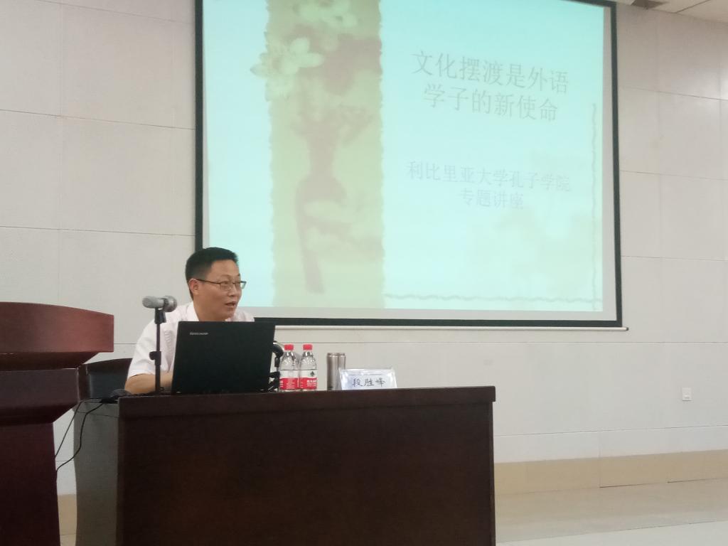 简短的启动仪式之后,段胜峰作首场报告。他以“文化摆渡是外语学子的新使命”为题,结合他在利比里亚大学孔子学院三年多的工作经历,详细介绍了我国文化“走出去”战略和孔子学院项目,以丰富的实景图片再现了在利比里亚教授汉语、推广中华文化、加强民间交流等“文化摆渡”工作。他曾担任开云官网利比里亚大学孔子学院的首任中方院长。谈及孔院草创之时的艰辛,面临缺场地、缺学生、缺支持、缺理解的困境,他感慨万分,饱含深情地说道:“我的背后是祖国,这种朴素的爱国情怀激励着我必须去奋斗。祖国把我派到这里来,就是让我来奋斗的!”报告会现场不时响起热烈的掌声。