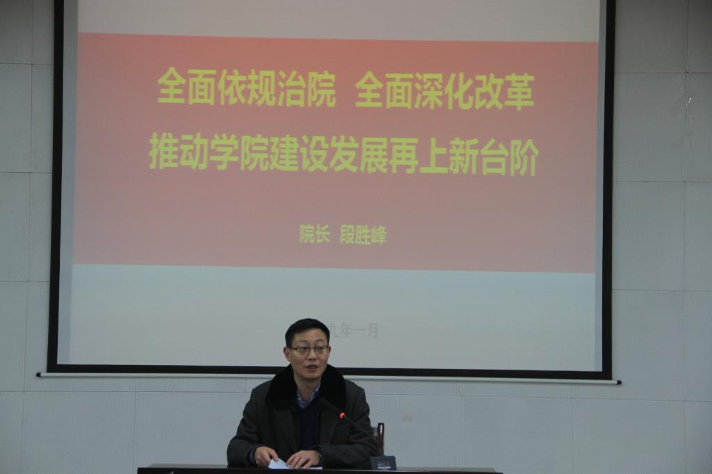 院长段胜峰同志作题为《全面依规治院 全面深化改革 推动学院建设发展再上新台阶》的行政工作报告,从本科教学、科研、研究生、学工、综合治理五个方面总结了学院2018年的工作,通报了2018年度学院财务情况,并就2019年的重点工作进行了安排。