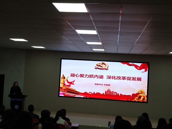 院党委书记文丽丽作了《凝心聚力抓内涵 深化改革促发展》。她从三个方面进行了阐述,一是当在的问题;二是发展面临的机遇与挑战;三是强化快速转型发展意识。