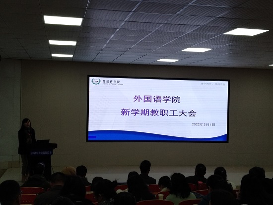 3月1日下午学院在文科楼圆厅A-100学术报告厅召开新学期教职工大会,会议由院党委副书记王双主持,全院教职工参会。