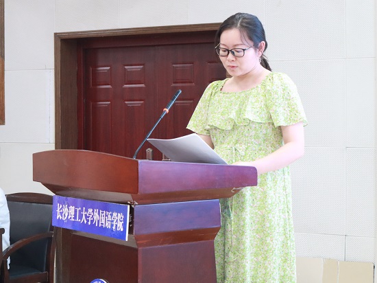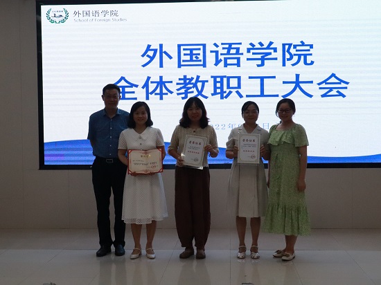 学院党委书记文丽丽和段胜峰院长为校级“优秀共产党员标兵”获奖者王浩萍老师、校级第九轮女职工“芙蓉杯”竞赛获得“芙蓉百岗明星”姚尧老师、校级第九轮女职工“芙蓉杯”竞赛获得“芙蓉百岗标兵岗”外国语学院英语专业教研室等先进个人和先进集体颁奖,并勉励学院全体教职工以“先进”为榜样,在各自岗位上做出成绩。