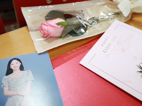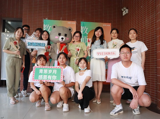 大会正式开始前,因临近教师节,学院学工办及学院工会精心组织了一场生动别致的感恩教师的活动,给每位老师送一张贺卡,洗好提前请专业摄影师给每位老师拍的艺术照,还配上一朵娇艳的玫瑰花。学生们在舞台表演了丰富多彩的节目,每位老师洋溢着幸福的微笑,师生们一起合影。