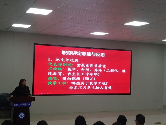 季红琴副院长作为一名刚评为教授,她从专业角度,谈职称评定总结与反思。她指出,一是把文件吃透;二是成果的系统性与传承性;三是把规定的硬指标提前完成;四是知己知彼。