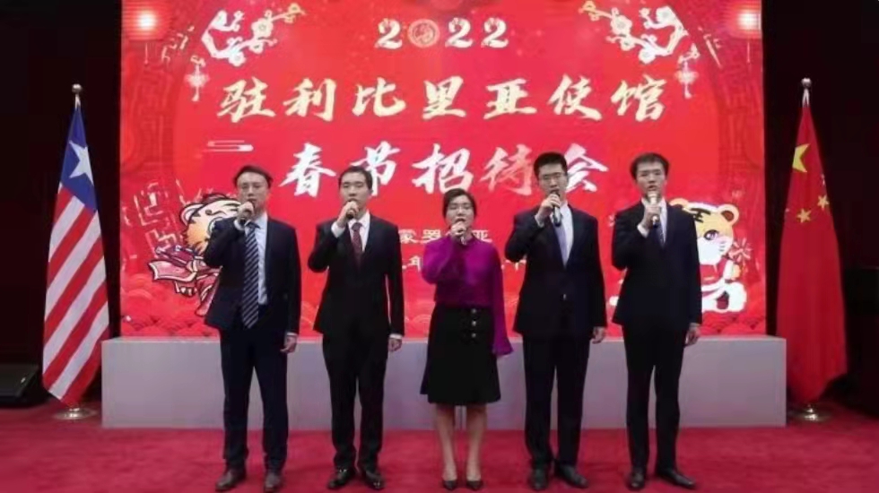 当地时间1月25日,中国驻利比里亚使馆举行2022年华侨华人春节“云端”招待会,在利中资企业、援外机构、旅利华侨华人代表及全体馆员约100人齐聚云端,共庆虎年新春。任义生大使发表新春致辞,向所有在利同胞致以亲切问候和美好祝福。招待会现场和各分会场喜气盈盈,气氛热烈。各与会代表共同祝愿伟大祖国繁荣昌盛,祝愿广大同胞生活幸福美满。