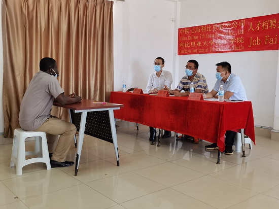 蒙罗维亚时间5月22日,为拓宽孔子学院学生的就业渠道,利比里亚大学孔子学院与中铁七局利比里亚分公司携手举办了人才招聘会。招聘会在孔子学院驻地活动中心举行。中铁七局利比里亚分公司47.1KM项目经理王博一行三人、利比里亚大学孔子学院外方院长Dexter、中方院长周红专、部分孔子学院师生参加了此次活动。