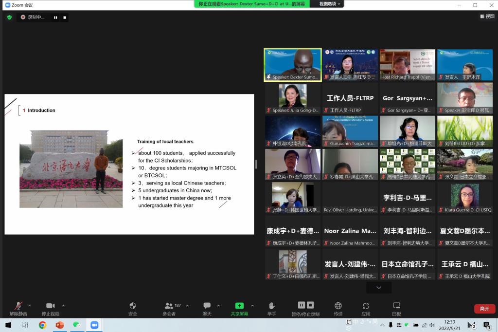 作为全球“孔子学院日”系列活动之一,由中国国际中文教育基金会联合北京外国语大学主办的“2022 年孔子学院院长论坛”于9月14日至24日举办。本次孔子学院院长论坛旨在进一步加强全球孔子学院间的协同合作,夯实孔子学院内涵式发展的基础,共同探讨未来可持续高质量发展之路。论坛包括2场专题讲座及3场分论坛研讨,近600名中外方院长报名参与,26位院长做主题发言。院长们畅所欲言,各抒己见,就孔子学院如何提升师资质量、孔子学院如何更好服务当地社会、塑造品牌形象、孔子学院如何因地制宜谋发展等议题发表自己的看法。9月21日,利比里亚大学孔子学院利方院长SUMO应邀在论坛上做了题为“如何解决利比里亚孔子学院面临的制约问题”的主题发言。