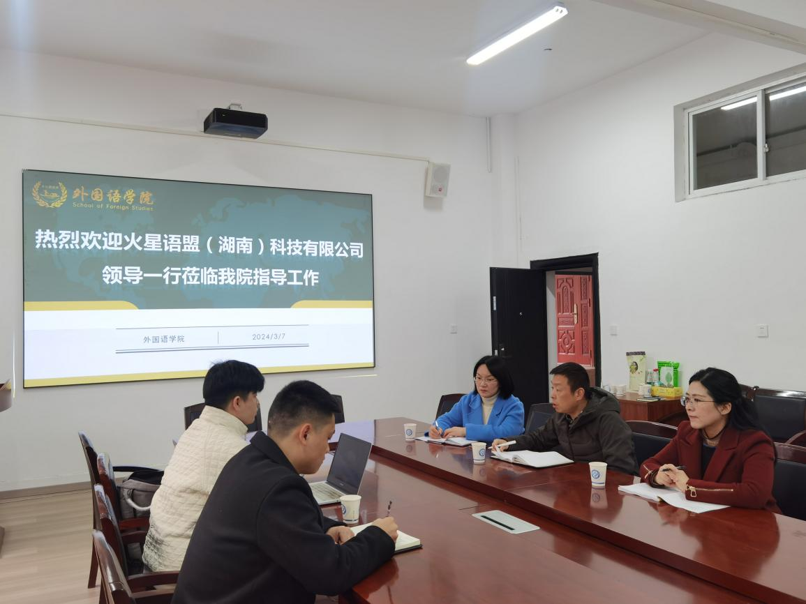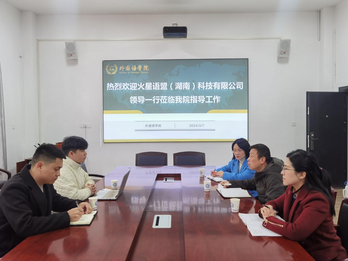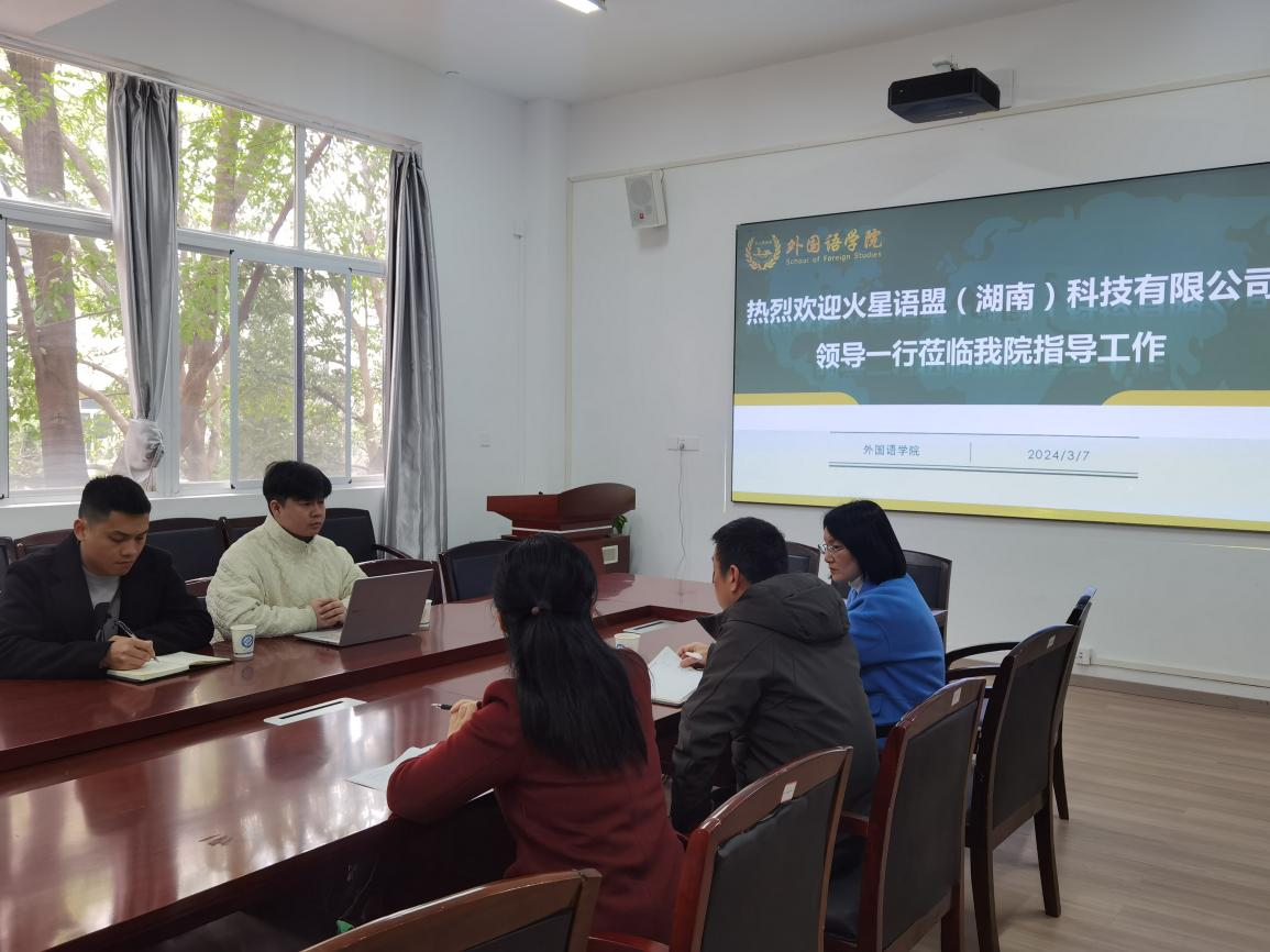 2024年3月7日上午,外国语学院于三号教学楼222会议室顺利召开第二次火星语盟(湖南)科技有限公司校企合作座谈会。