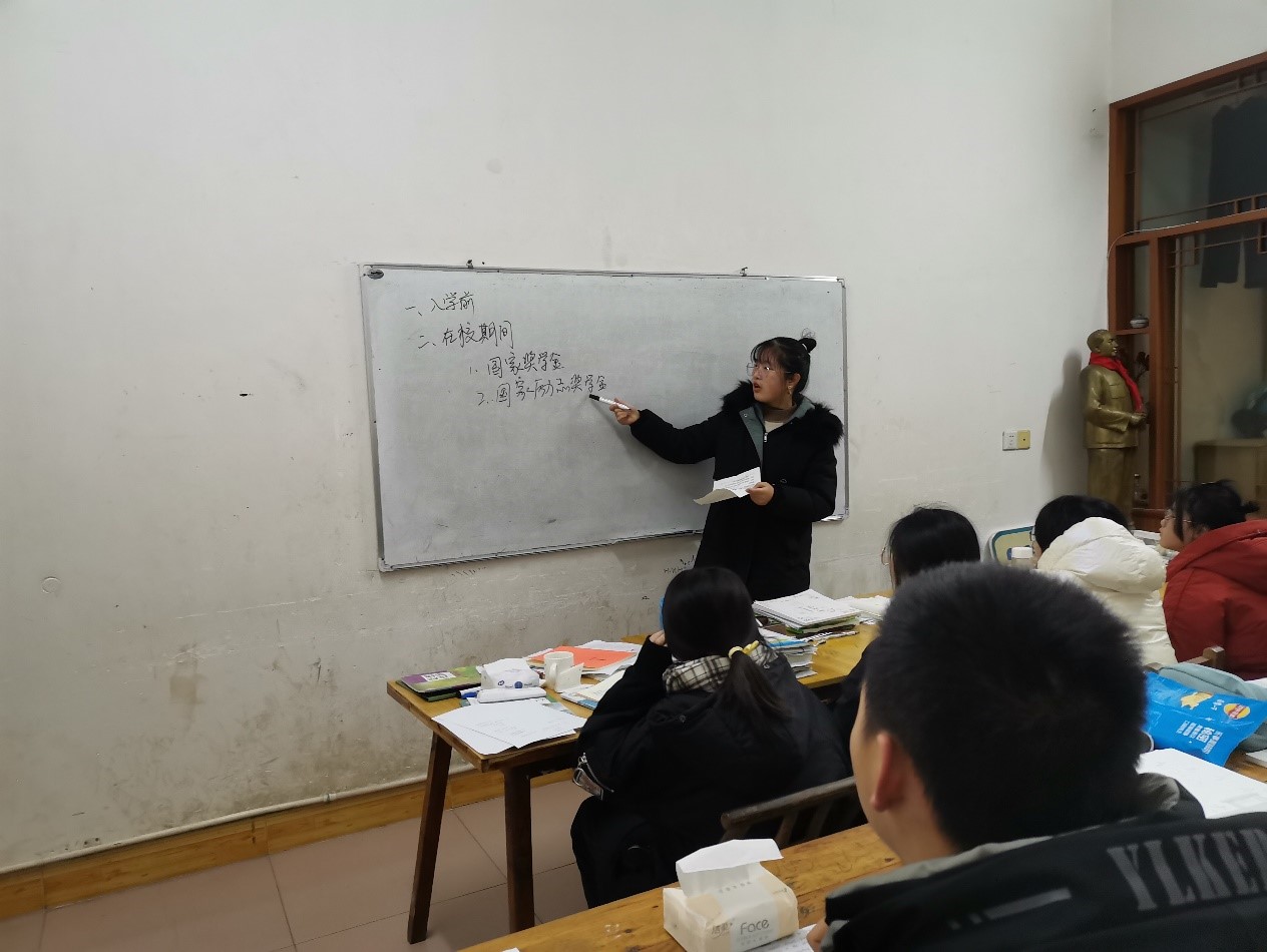 1月25日,她联系村委会干部说明自己的想法,村委会干部十分赞同她的想法,帮助她通过微信联系村上学生。她向村干部提出在村委会图书室邀请村上学生来此自习,给学生们提供为期一星期的自律学习场所。期间,她向村里学生介绍长理风采,分享她的大学生活,并鼓励他们以后报考开云kaiyun体育,然后借助图书室的白板讲述大学生资助政策,消除他们对入学前家庭经济情况困难的担忧,让他们能够安心学习。
