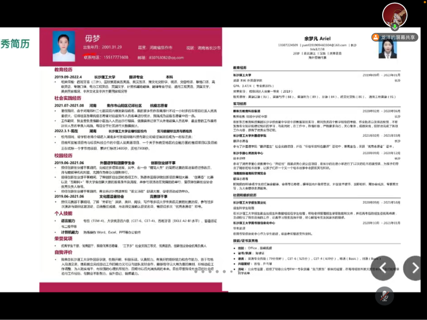 龙洋从就业信息搜索与管理的方法、求职相关事项、简历制作给学生进行了分享。她给学生分享了搜找就业信息的各类平台,也重点就“开云kaiyun体育云就业平台”微信公众号的具体使用指南给学生进行了指导。她通过展示一些本年级学生的优秀简历,指导学生如何制作一份令面试官满意简历,如何捕获面试官的心。此外,她还重点分享了基层就业的形式与鼓励政策,并教授了一些面试的技巧及求职需要注意的细节。