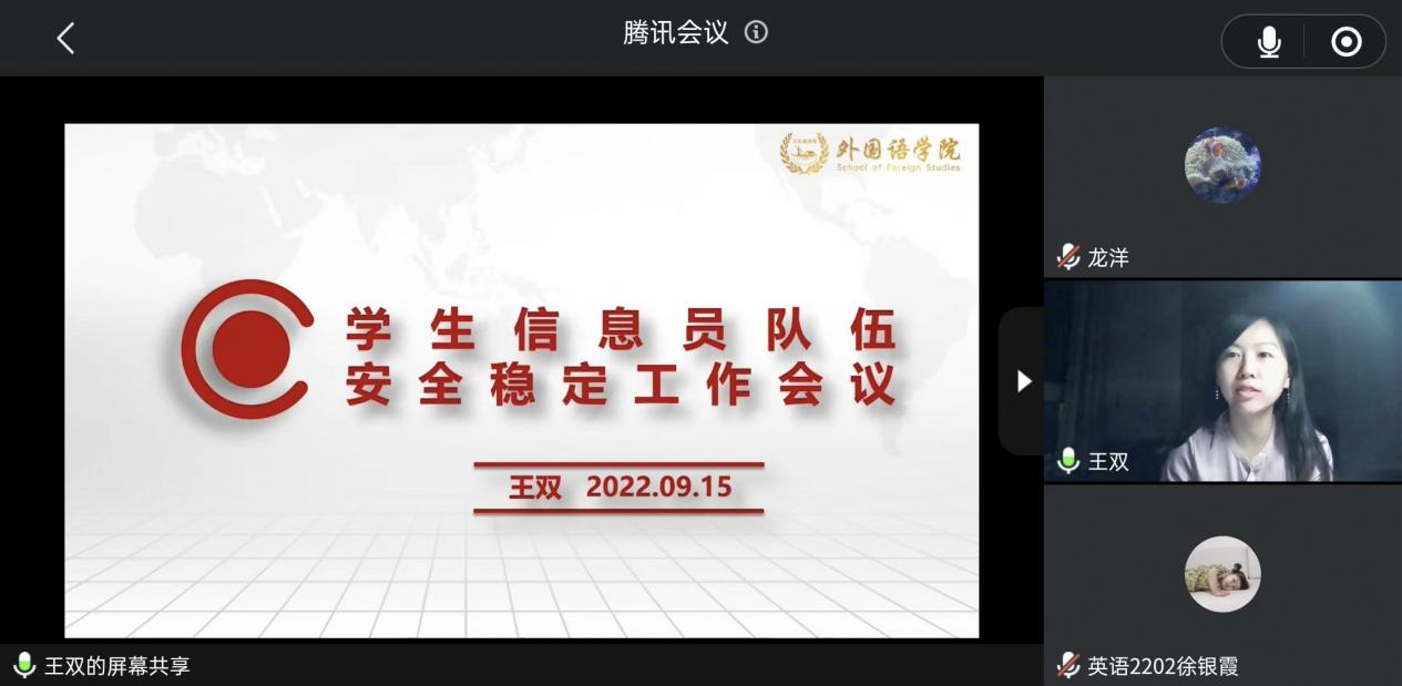 为进一步维护校园的安全稳定,拓宽学生工作信息渠道,充分发挥学生在安全教育管理活动中的主体作用,9月15日晚19:30,外国语学院通过腾讯会议召开学生信息员队伍工作会议,学院党委副书记王双,各年级辅导员,各班班长、团支书,各学生党支部书记参加会议。